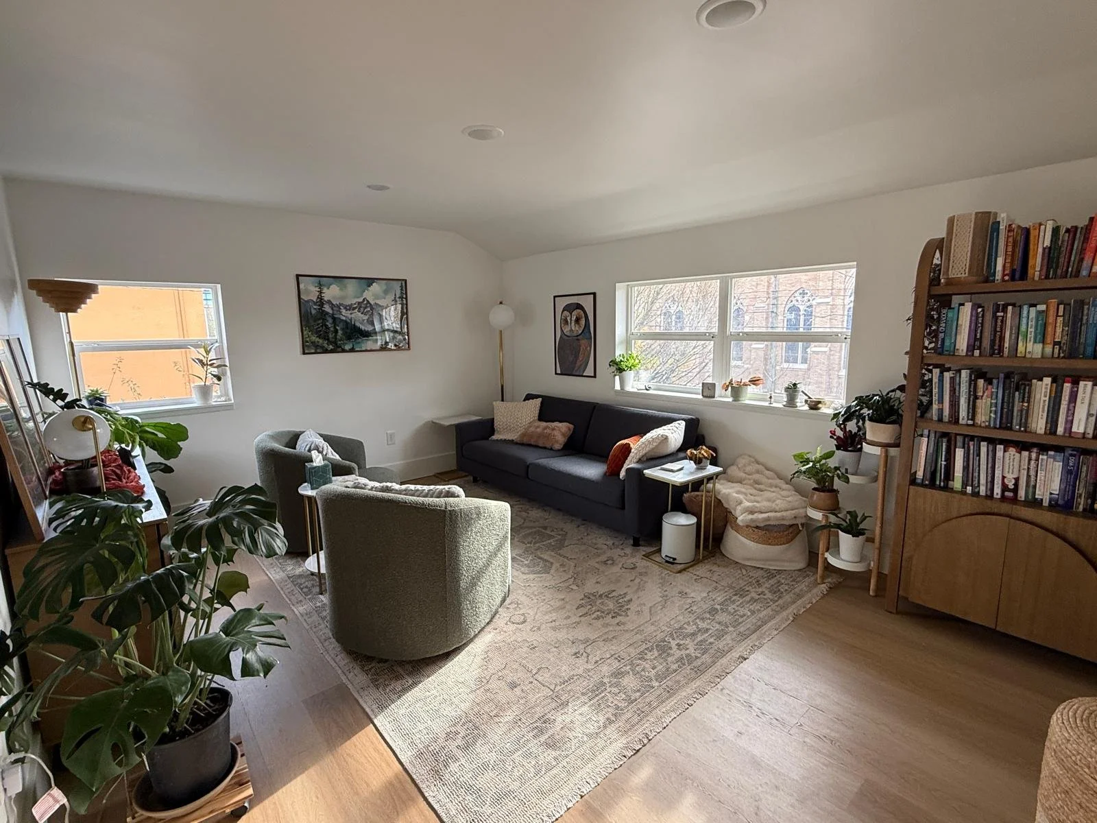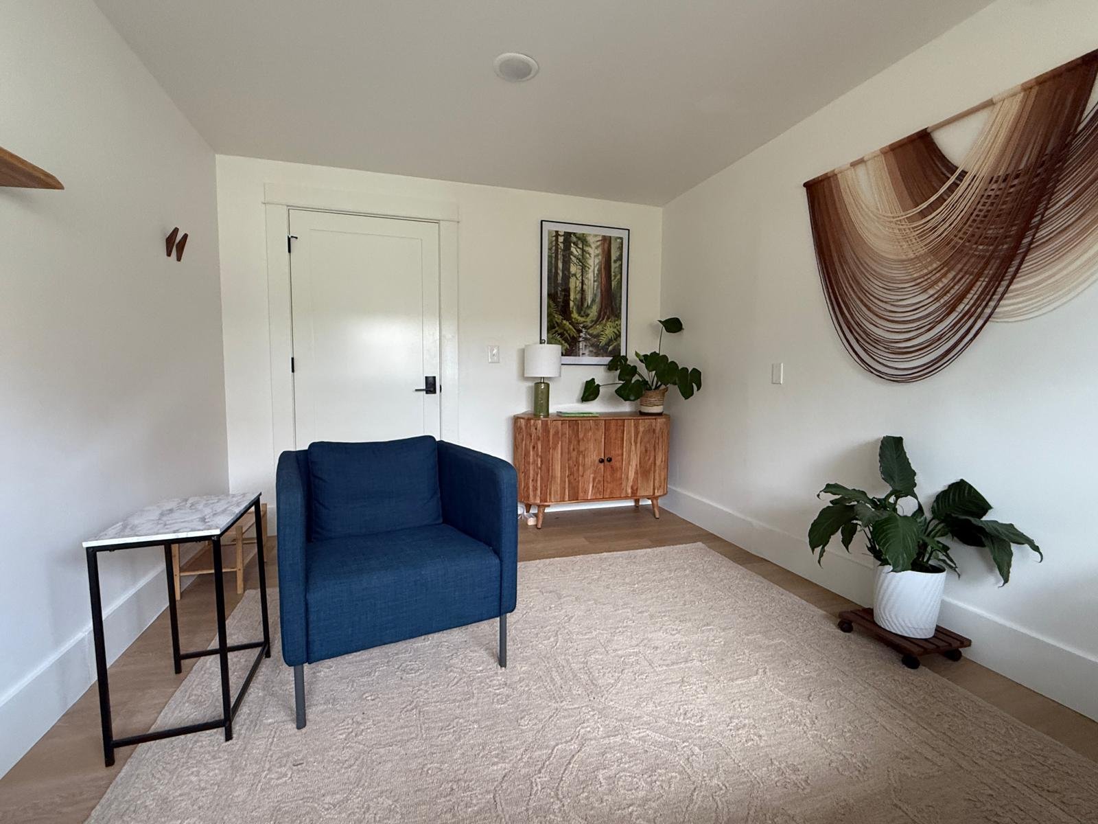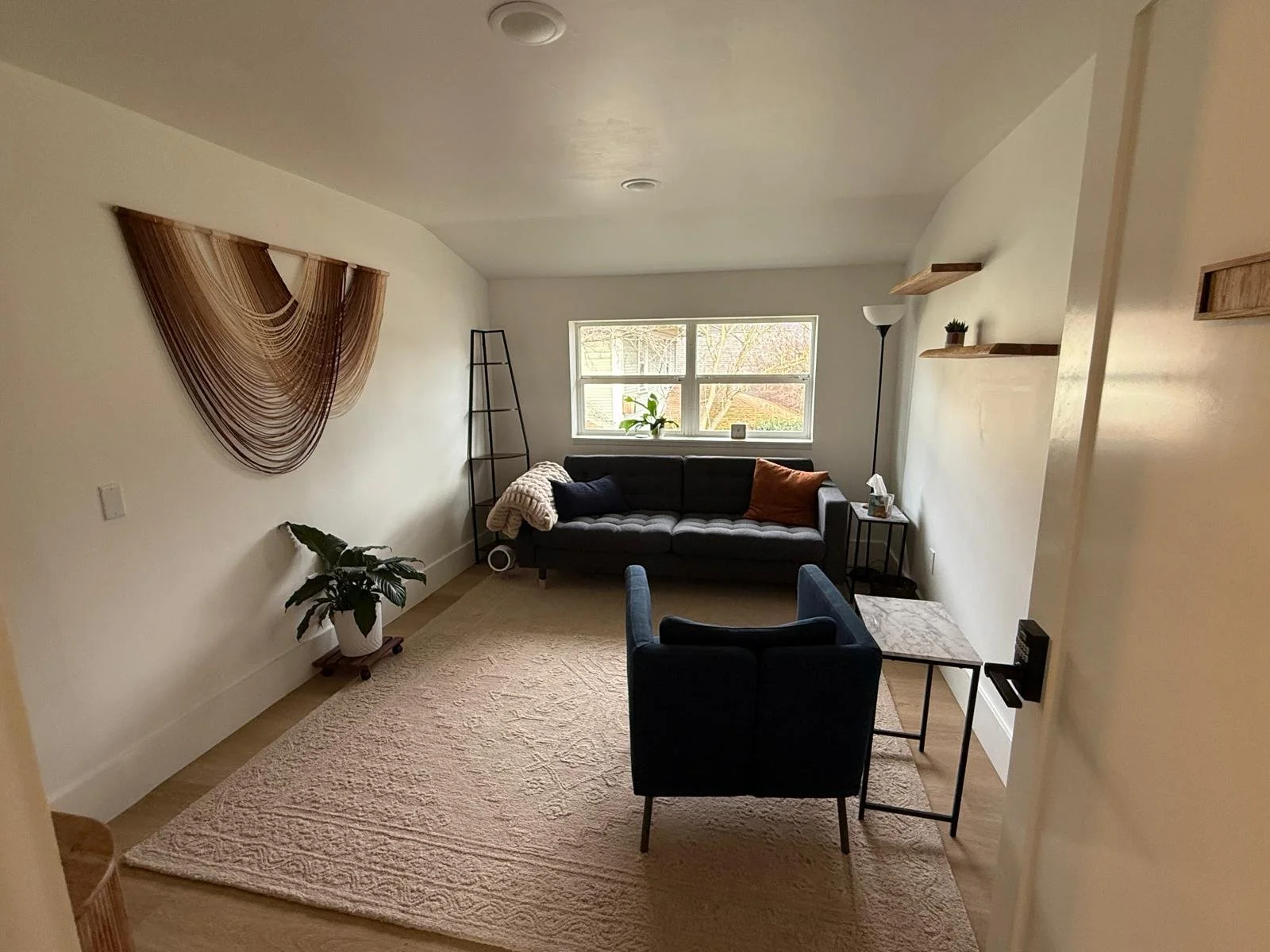 Spacious and bright. Modern and clean furnishings, including a 2-seater couch, a comfortable chair, storage bureau. (potential to use a massage table, table warmer, bolster, blanket, bluetooth speaker, and rolling stool for table work)