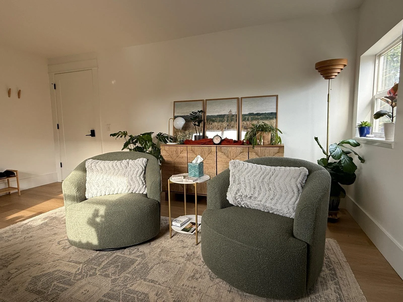 This room is spacious and bright. Modern and clean furnishings, including a sofa and 2 swivel chairs. (potential to use a massage table, table warmer, bolster, blanket, bluetooth speaker, and rolling stool for table work)